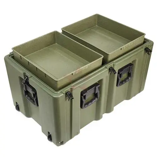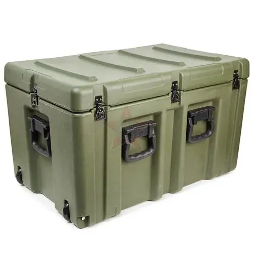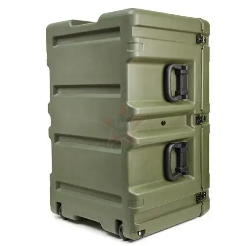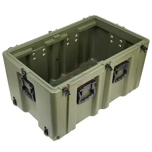 Элементы корпуса кейса сделаны методом ротационного формования из высокопрочного полиэтилена. Фурнитура изготовлена из нержавеющей стали в виде замков "бабочка" с петлями для навесных замков и пломб. Ручки выполнены из того же пластика и плотно прилегают к корпусу за счет того, что подпружинены.